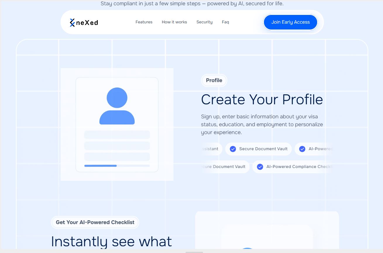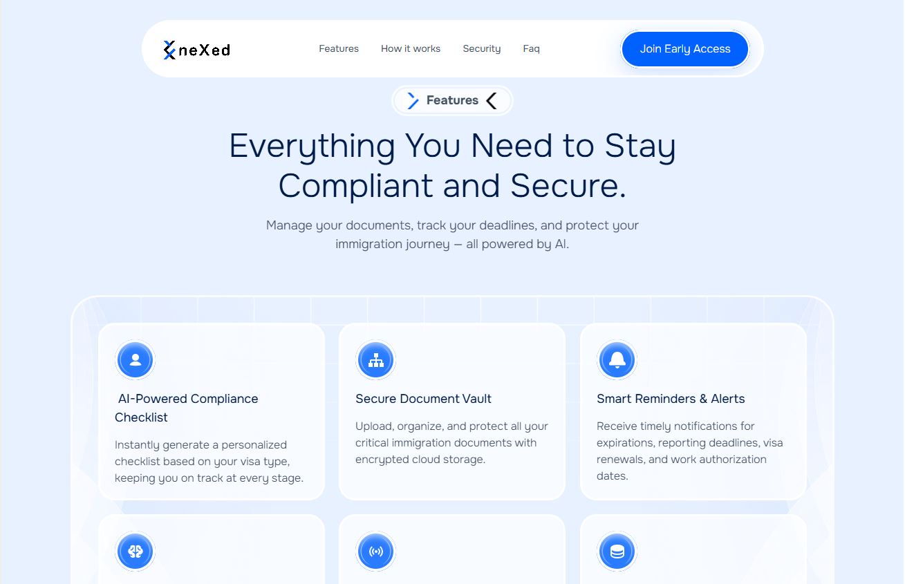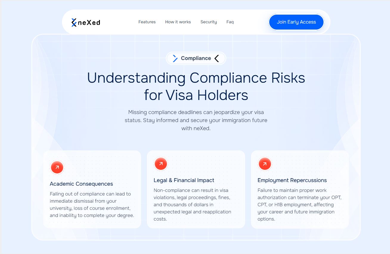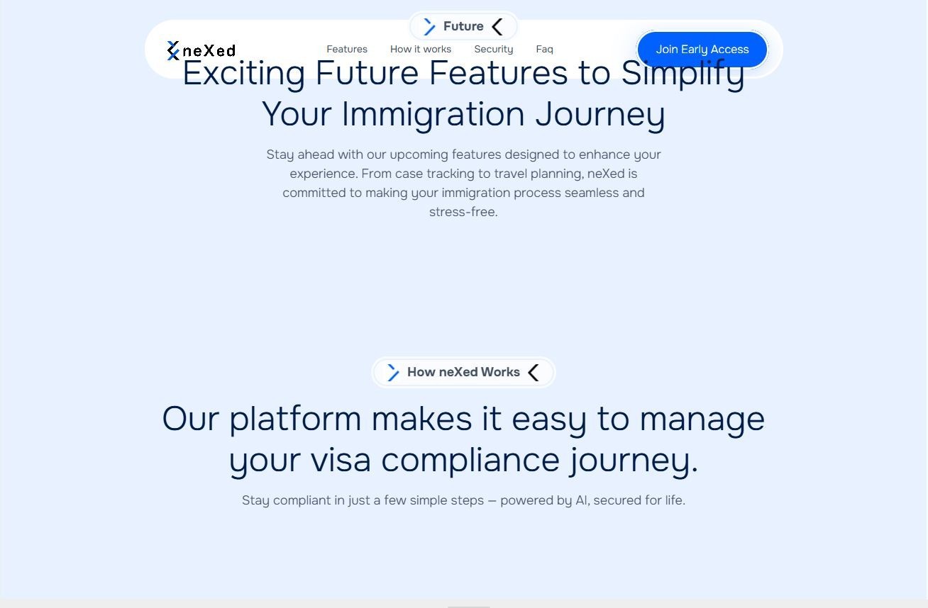 Complete brand identity and digital platform design for neXed, an immigration compliance SaaS startup serving international students and universities. From logo to full website development, we built a trustworthy brand presence that validated market demand and captured early user signups in the competitive edtech space.